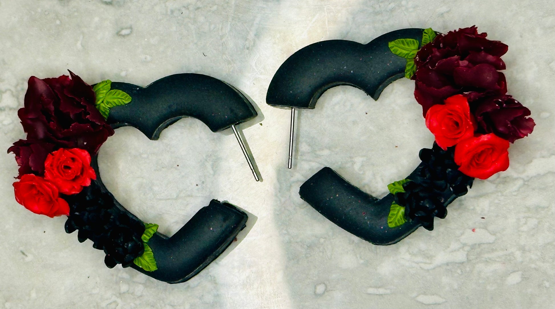 Heart shaped black chunky hoops with a beautiful red bouquet of hand made flowers.