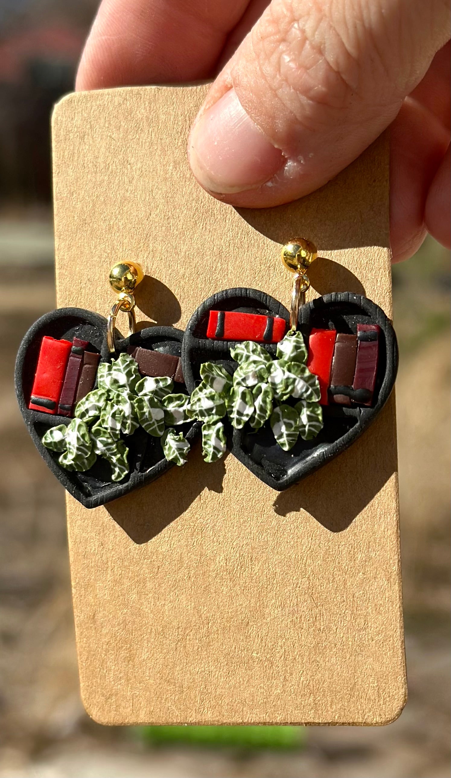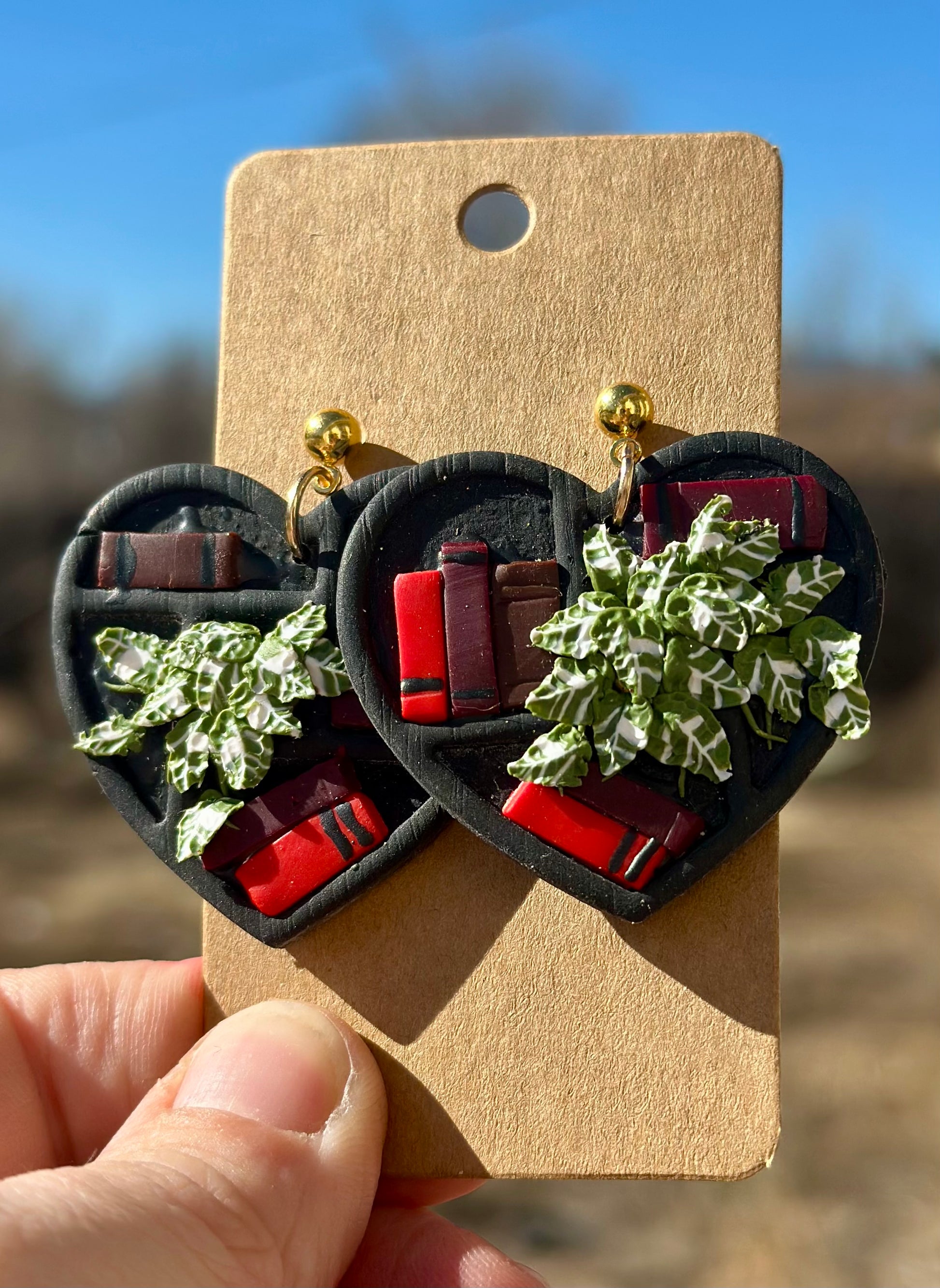 A black bookshelf with red and brown books and a variegated vining plants to add to the whimsy. This set comes in a large and small size.