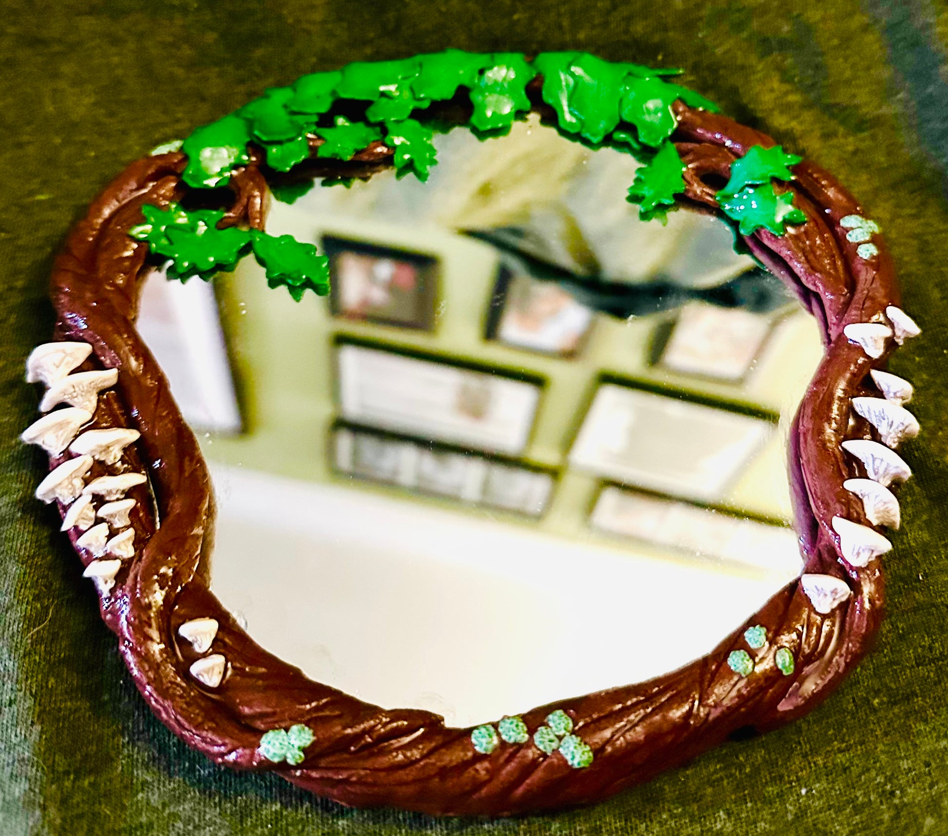 6” mirror with a frame of branches, leaves and mushrooms to create a lightweight mirror. There mirror has a felt back and is sealed with resin.